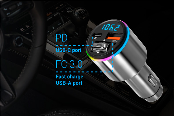 Enjoy your favorite music and talk safely while driving with NAVITEL BHF07 MAX. This FM-transmitter combines sleek design, great connectivity features and capabilities of a charging device. It boasts a handful of functions like hands-free, music playback via AUX port or Bluetooth, as well as USB-A & USB-C ports and even a voltage meter to keep track of your car’s battery health.