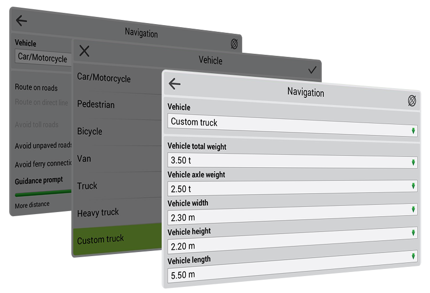 The Navitel Navigator program pre-installed on the NAVITEL E501 offers an extended set of settings for navigating heavy vehicles. Select the type of freight transport in the settings or create your own vehicle by adding its parameters: length, width, height, maximum permitted and actual weight, axle load, etc., and the program will build routes taking into account road restrictions for this type of transport, allowing you to travel freely to your destination.