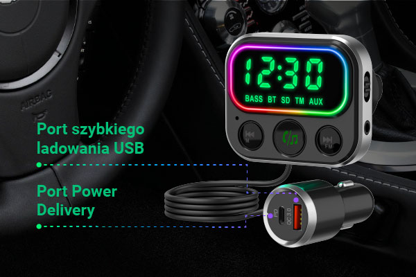 Urządzenie zostało podzielone na 2 części dla większej wygody użytkowania. Ładowarkę podłącza się do gniazda zapalniczki, natomiast funkcjonalny wyświetlacz można podłączyć do kratki wentylacyjnej lub za pomocą dodatkowej podstawki przymocować do deski rozdzielczej samochodu.