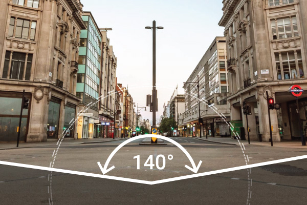 Kąt widzenia kamery wynosi 140° i pozwala zarejestrować wszystko, co dzieje się na drodze przed samochodem, włącznie z sąsiednimi pasami ruchu i poboczem.