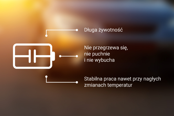Zastosowany w kamerze superkondensator zwiększa niezawodność i stabilność kamery, podtrzymując jej zasilanie bez względu na czynniki zewnętrzne (np. upał, mróz), czy też gdy zasilanie zostanie wyłączone podczas wypadku.