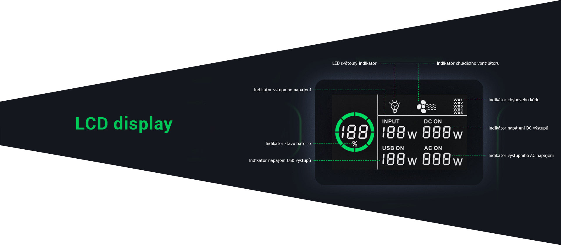 Velký inteligentní displej zobrazuje všechny relevantní informace o nabíjení, jako úroveň baterie, zbývající výkon, době chodu, indikátor AC/DC, upozornění na řešení problémů a další. Mějte přehled o všem podstatném jediným pohledem na displej.