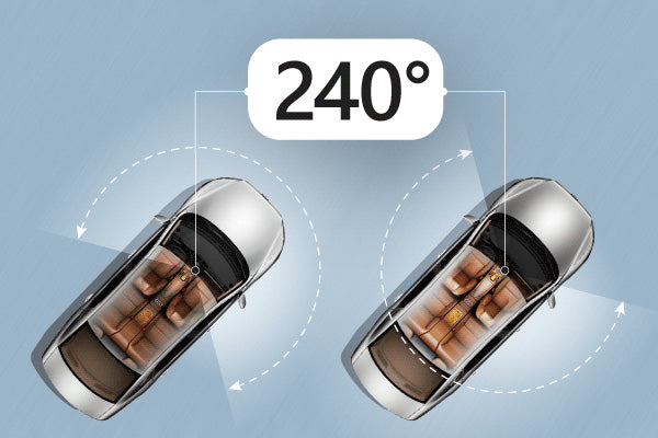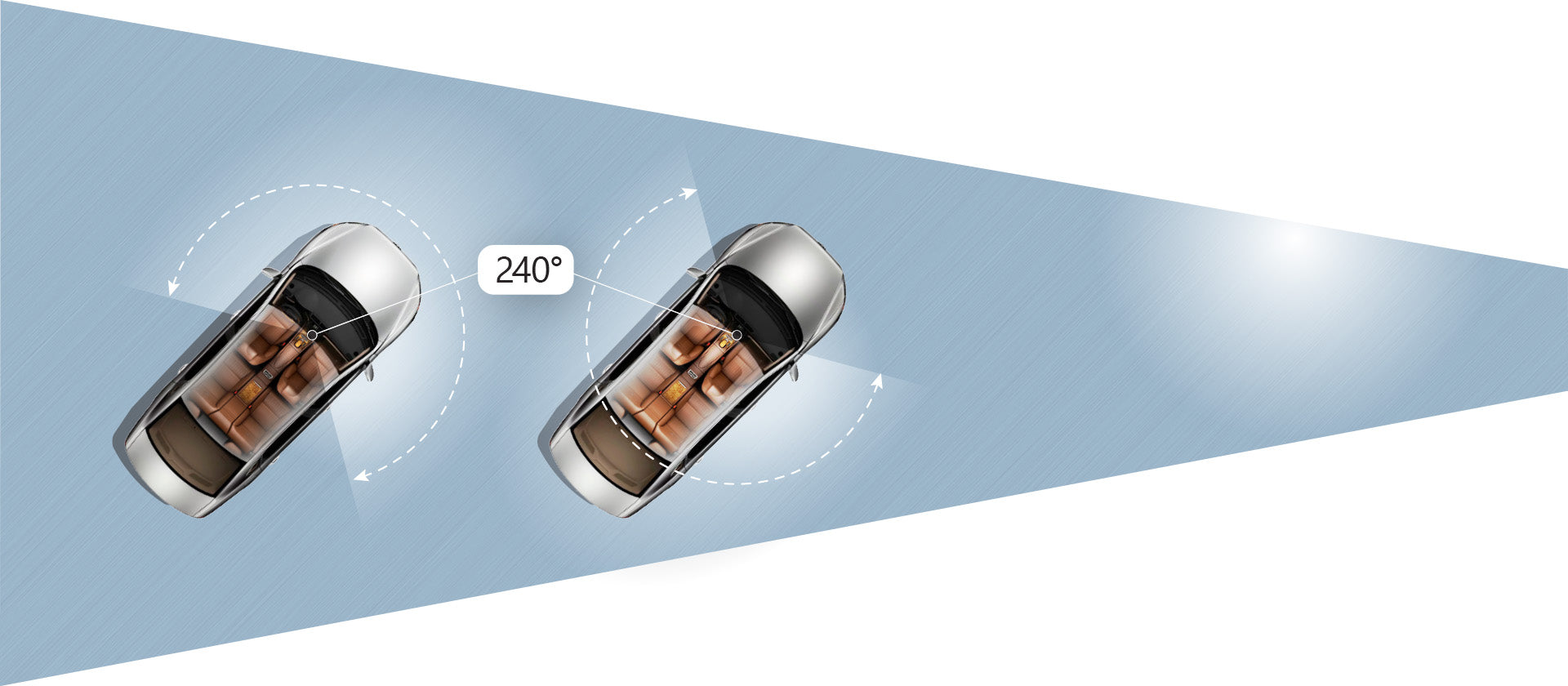 NAVITEL RS3 DUO WIDE vidí vše díky zornému poli obou kamer, které je dimenzováno na 240° na každou. To sčítá až 480° celkového zorného pole a poskytuje téměř panoramatické ovládání každé události, která se odehrává venku nebo uvnitř vozidla. Neunikne ani jeden detail, ať už jde o chodce na chodníku, vozidlo přijíždějící z vedlejší silnice nebo policejního inspektora přijíždějícího po straně řidiče.