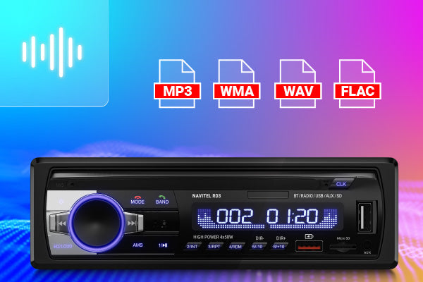 NAVITEL RD3 přehrává nejoblíbenější formáty mediálních souborů: FLAC, MP3, WMA, WAV. Na předním panelu je také AUX vstup, slot pro paměťovou microSD kartu až do 256 GB a dva USB porty, z nichž jeden lze využít pro připojení flashdisku až do 256 GB a druhý slouží k nabíjení smartphonu a podporuje nabíjení až 2,1A.