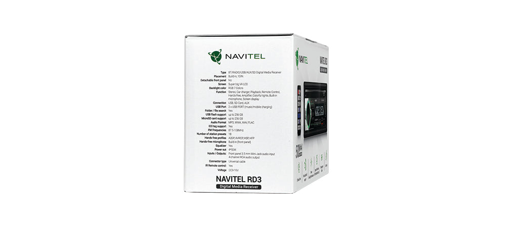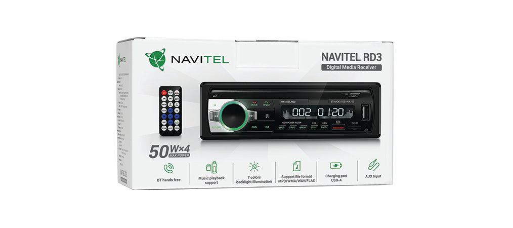 NAVITEL RD3 je multifunkční autorádio ve standardní velikosti 1DIN. Radio je vybaveno digitálním FM modulem s rozsahem příjmu FM 87,5-108 MHz, do paměti lze uložit 18 stanic, které lze snadno přepínat pomocí tlačítek na předním panelu. Zařízení poskytuje ovládání basů a výšek, stejně jako několik přednastavených nastavení ekvalizéru. Díky RCA výstupům můžete k zařízení připojit i externí zesilovač.