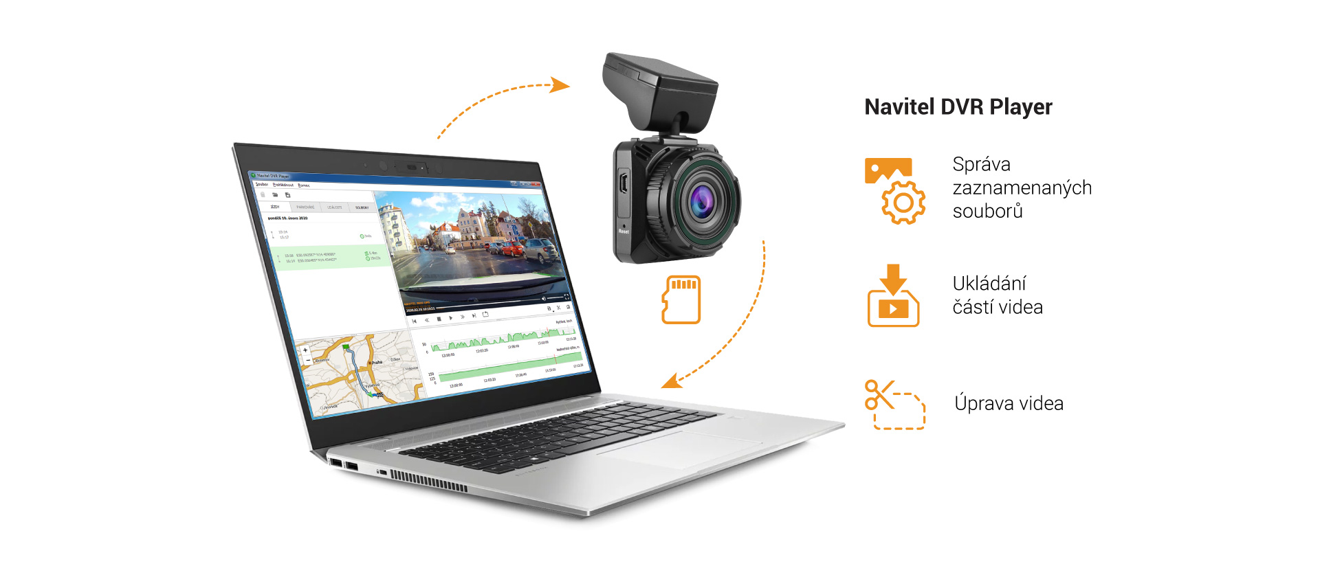 Pro kompresi videa se používá formát H.264, který si zachovává vynikající kvalitu obrazu i při malé velikosti souboru. Podporovány jsou karty microSD až do velikosti 256 GB.