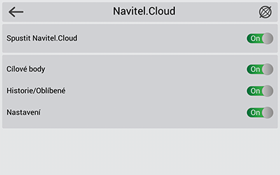 Služba Navitel.Cloud vám umožní uložit vaše nastavení, cílové body a historii vyhledávání na cloudové datové úložiště. Data uložená na cloudu pak mohou být obnovena v případě přeinstalování programu. Pokud používáte Navitel Navigator na několika zařízení, cílové body a historie mohou být navzájem synchronizovány, což vám ušetří čas, protože potřebné soubory nemusíte mezi zařízeními přenášet.