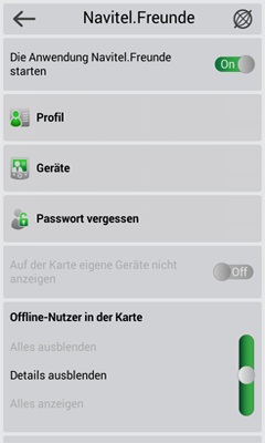 Wenn Sie den Dienst Navitel.Freunde verwenden möchten, müssen Sie sich auf https://navitel.cz/de registrieren und mindestens ein Gerät mit einer aktivierten Lizenz Navitel Navigator haben. Dieses Gerät sollte in der Sektion „Mein Gerät“ in Ihrem „privaten Bereich“ auf der aufgeführten Internetseite hinzugefügt werden.