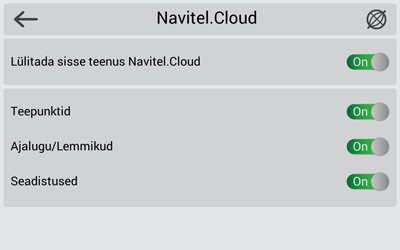 Kui sellist ikooni tööriistaribal pole siis võimalik, et see ei mahu kehtiva ekraani paigutuse tõttu sinna ära. Proovige ekraani paigutus ära muuta. Kui ikooni ei tekkinud, valige Menüü > Seaded > Kasutajaliides > Kaardi ikoonid, seejärel aktiveerige Navitel.Pilv ikooni kuvamine. - Avanenud Navitel.Pilv aknas vajutage Käivitada.