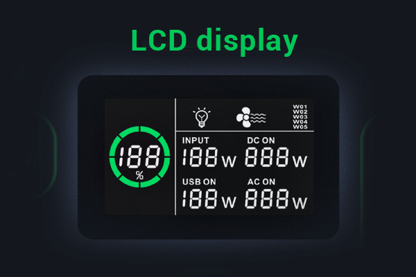 The large smart screen clearly shows all the information you need about operation and battery level, including remaining output and runtime, AC/DC indicator, troubleshooting alert, and more. Bring peace of mind on off-grid power.