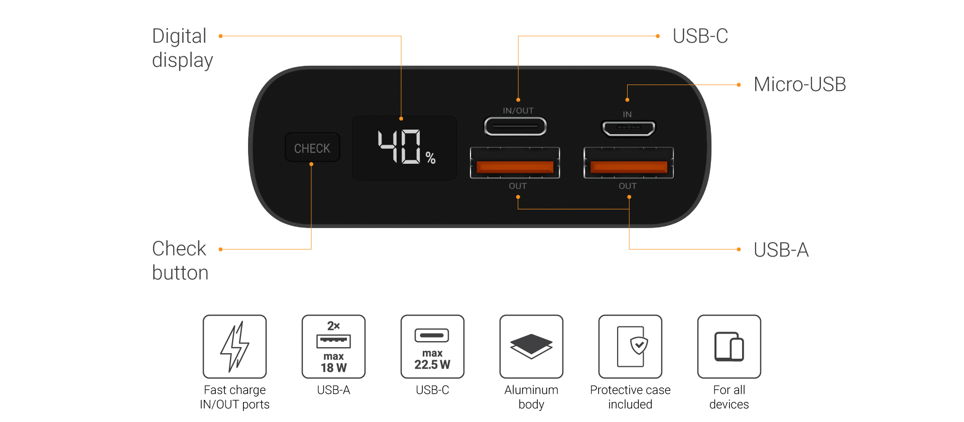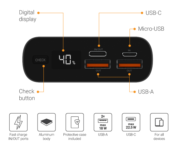 NAVITEL PWR20 AL BLACK is a portable external battery with a capacity of 20000 mAh. Two USB-A ports and a two-way USB-C port that support fast charging protocols allow you to simultaneously charge multiple electronic devices, such as a smartphone, tablet, and fitness band. The body of the PWR20 AL BLACK is made of aluminum, which dissipates heat well and protects the device from overheating. The digital display on the case helps you keep track of the remaining battery power so that you don’t be left without a backup power source at the most inopportune moment.
