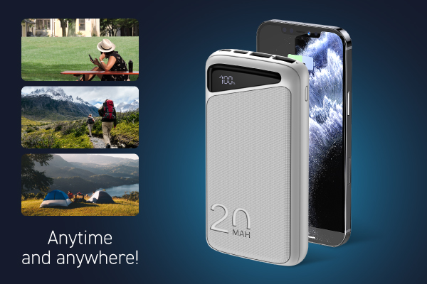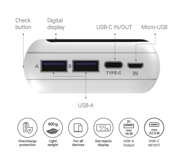 NAVITEL PWR20 MX WHITE is a portable external battery with a capacity of 20000 mAh. Two USB-A ports and a reversible USB-C port allow you to charge multiple devices at the same time. A capacity of 20,000 mAh is enough for several cycles of recharging a tablet, smartphone, smart watch or player. For visual control of the remaining charge level, a digital display is located on the case.