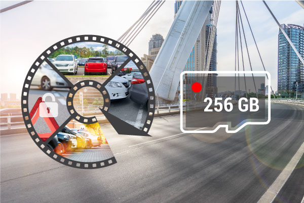 NAVITEL R99 4K records videos in separate segments with adjustable duration. This feature allows the DVR to automatically free up space on the card with a capacity up to 256GB by overwriting older unprotected videos.