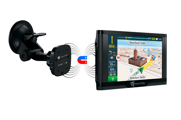 It is enough to bring the device and the base into proximity to securely fix the GPS. After that, it will automatically turn on and launch the navigation software. The strong magnet holds the device securely while driving. The GPS turns off automatically 15 seconds after its removal from the base. Installation and removal take only a few seconds.