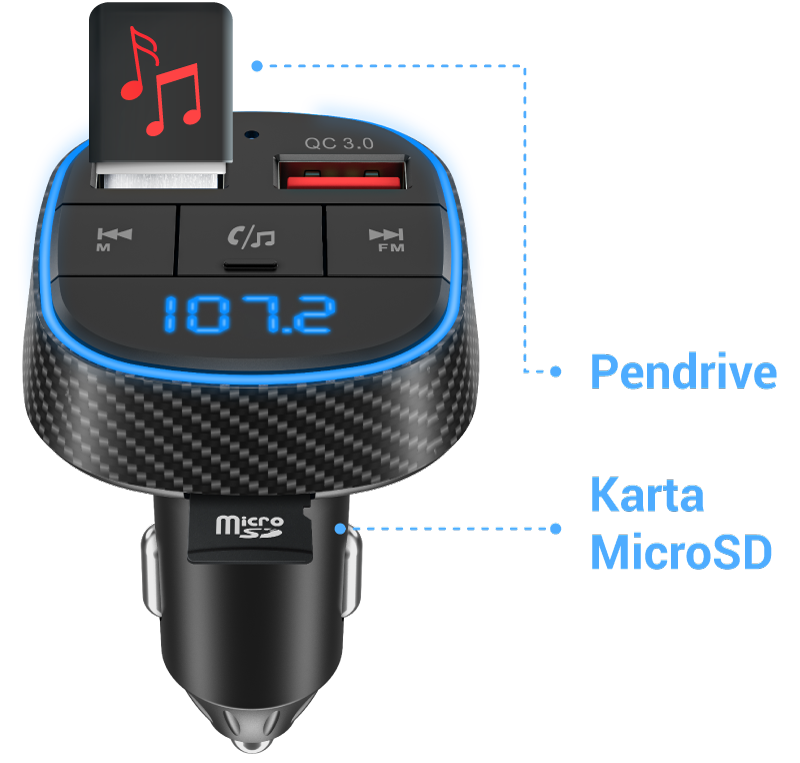 Dzięki nadajnikowi możesz również odtwarzać utwory zapisane na pamięci USB lub karcie microSD w samochodzie. Podłącz pamięć USB do lewego gniazda USB lub włóż kartę pamięci do gniazda, a odtwarzanie plików MP3 rozpocznie się automatycznie.