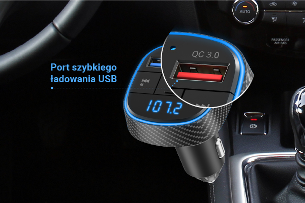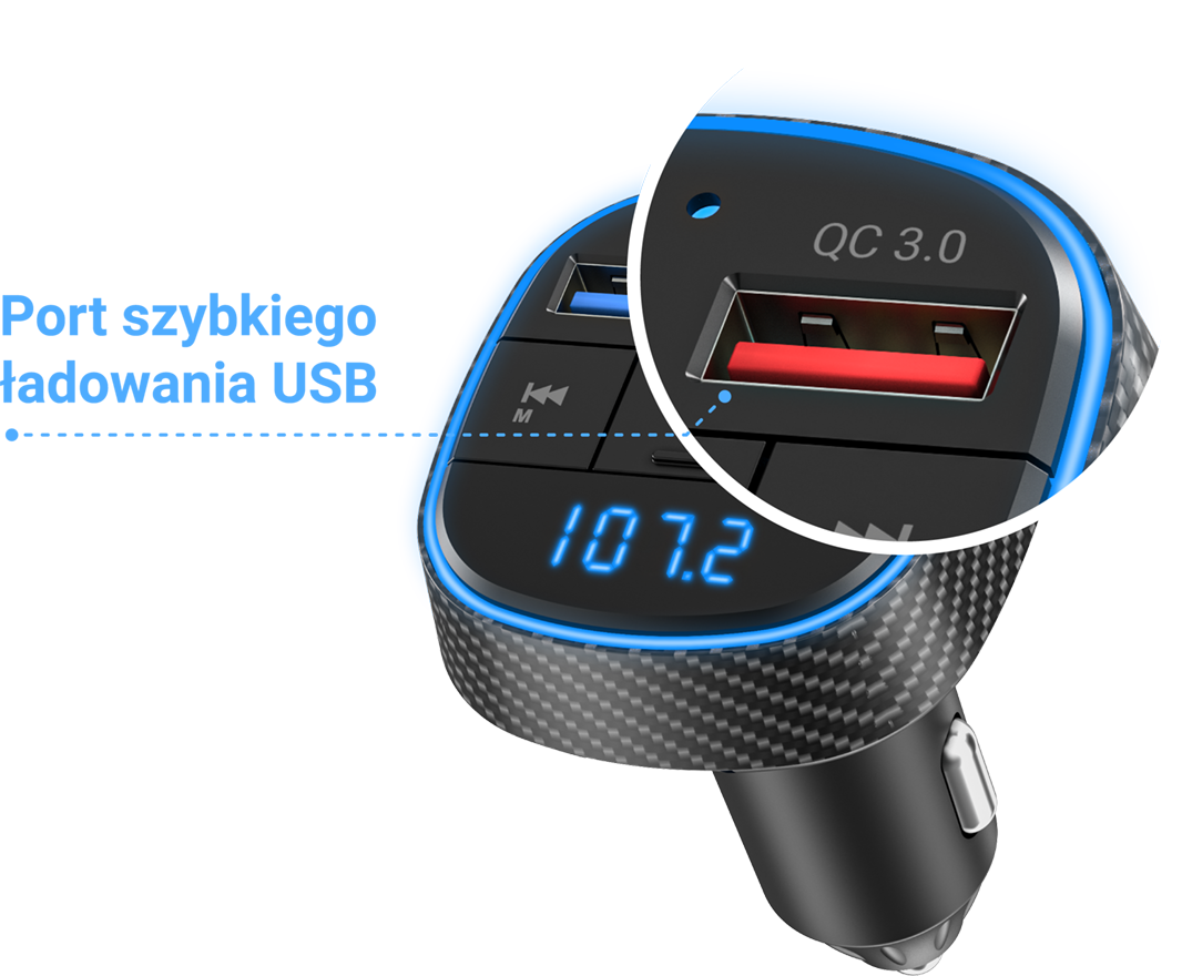 Nadajnik FM jest bardzo praktyczny, ponieważ umożliwia słuchanie muzyki, a także może być używany jako ładowarka. Podłącz smartfon lub inne urządzenia do gniazda Fast Charge USB za pomocą kabla USB i ładuj je z dużą prędkością za pomocą gniazda samochodowego. Technologia Fast Charge gwarantuje niezwykle szybkie ładowanie – szybsze niż w przypadku konwencjonalnych technologii ładowania.