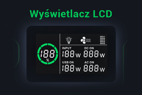 Inteligentny ekran wyświetla wszystkie potrzebne informacje na temat działania i poziomu naładowania baterii, w tym pozostałą moc wyjściową i czas pracy, wskaźnik AC/DC, alert dotyczący rozwiązywania problemów i wiele innych.