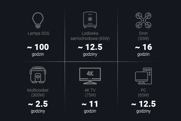 NAVITEL NS1000 wyposażony został w gniazdo AC (230V, 1000W), 2 porty USB, 2 porty USB-C, 2 porty DC, 1 port samochodowy oraz funkcję ładowania bezprzewodowego 15W. Zapewnij stabilne i bezpieczne zasilanie dla większości swoich urządzeń (poniżej 1000W), takich jak laptopy, telefony, aparaty fotograficzne, drony, latarki, wentylatory, lodówki samochodowe itp. NS1000 sprawdzi się jako źródło energii podczas aktywności na świeżym powietrzu (kemping, podróż z przyczepą kempingową, wędkarstwo, łowiectwo, żeglarstwo) i na wypadek sytuacji awaryjnych w domu (przerwa w dostawie prądu, huragan).
