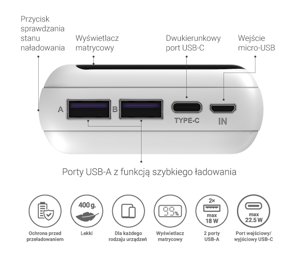 NAVITEL PWR20 MX WHITE monitoruje moc i pojemność baterii podłączonych urządzeń. Rozdziela przepływ energii i zapewnia równomierne ładowanie oraz ochronę ładowanych urządzeń przed przeciążeniem. Korpus urządzenia wykonany został z wytrzymałego tworzywa sztucznego. Jego powierzchnia jest odporna na zarysowania i otarcia. Dzięki kompaktowym wymiarom 145x69x28 mm i niewielkiej wadze 400 gramów, PWR20 MX WHITE bez problemu zmieści się w kieszeni plecaka lub torby i będzie niezastąpionym towarzyszem w podróży, na spacerze itp.