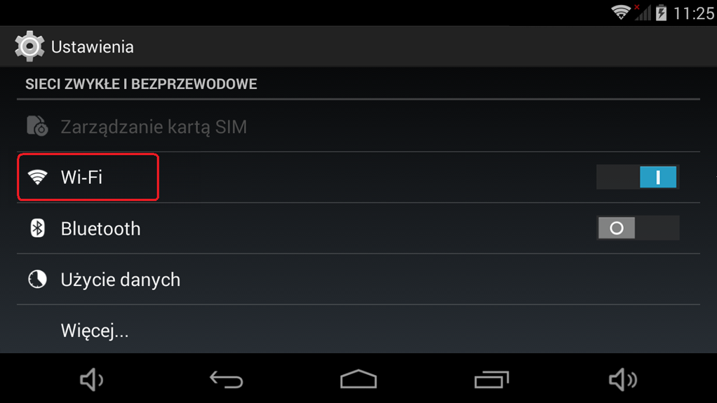By mieć możliwość aktualizacji urządzenia należy podłączyć je do Wi-Fi. By włączyć Wi-Fi wejdź w 'Aplikacje > Ustawienia > Wi-Fi' i przesuń przycisk w prawo (zmieni kolor na niebieski).