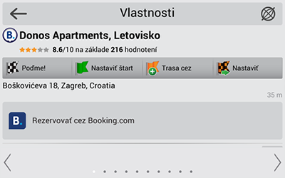 Služba Booking.com je integrovaná do Navitel Navigator a umožňuje vám rezervovať si hotel bez nutnosti ukončenia programu. Ak máte túto funkciu zapnutú, môžete vidieť na mape hotely, ktoré môžu byť prostredníctvom služby Booking.com rezervované a prostredníctvom funkcie Nájsť a možnosti Body záujmu/POI zvolením kategórie Ubytovanie.